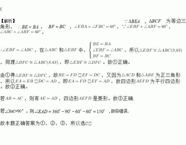 如图,以△ABC的三边为边分别作等边△ACD、△ABE、△BCF,则下列结论:①△EBF≌△DFC;②四边形AEFD为平行四边形;③当AB=AC时,四边形AEFD是菱形;④当∠BAC=90°时,四边形AEFD是矩形.其中正确的结论有( )个
