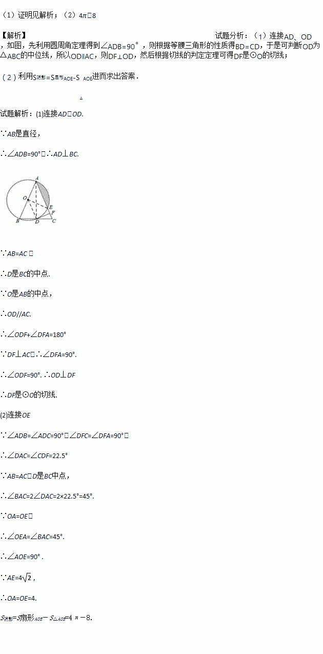 如图,在△ABC中,AB=AC,以AB为直径的⊙O分别与BC,AC交于点D,E,过点D作DF⊥AC,垂足为F.