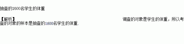 为了解某市参加中考的32000名学生的体重情况,抽查了其中1600名学生的体重进行统计分析,这个问题中的样本是________________________________________.