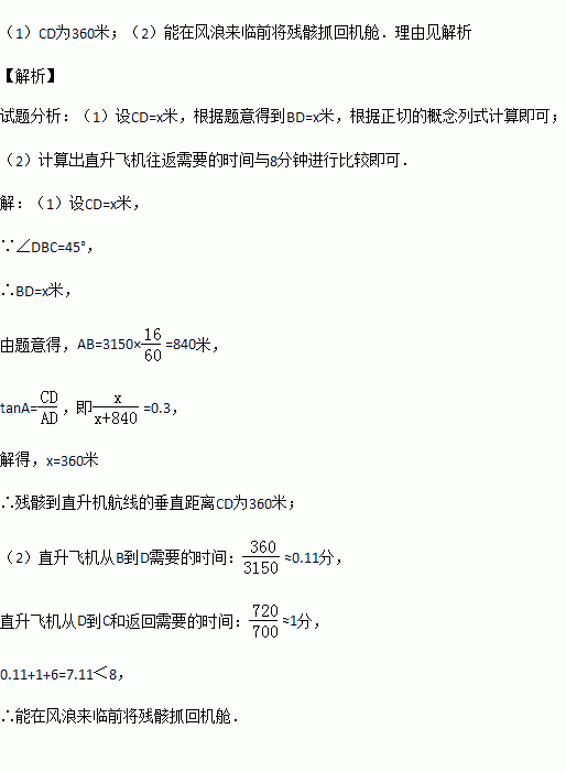 (2)在B点时,机组人员接到总指挥部电话,8分钟后该海域将迎来比较大的风浪,为了能及时观察取证,机组人员决定飞行到D点立即空投设备,将残骸抓回机舱(忽略风速对设备的影响),己知设备在空中的降落与上升速度均为700米/分.设备抓取残骸本身需要6分钟,请问能否在风浪来临前将残骸抓回机舱?请说明理由.