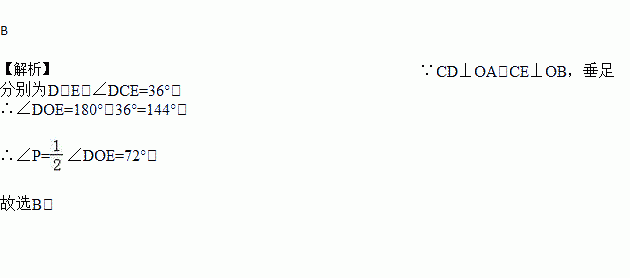 如图,点A,B,C,P在⊙O上,CD⊥OA,CE⊥OB,垂足分别为D,E,∠DCE=36°,则∠P的度数为( )
