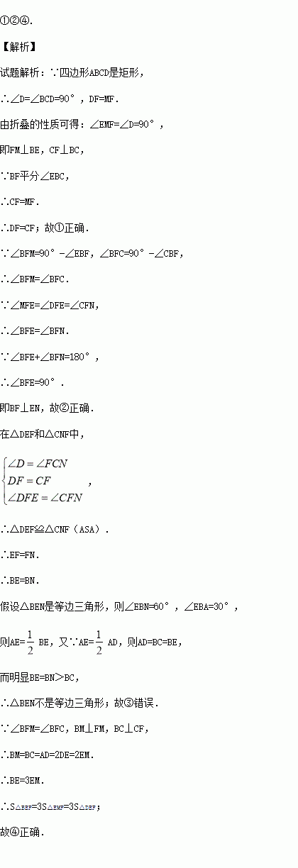 如图,在矩形ABCD中,点E是AD的中点,∠EBC的平分线交CD于点F,将△DEF沿EF折叠,点D恰好落在BE上M点处,延长BC、EF交于点N,有下列四个结论:①DF=CF;②BF⊥EN;③△BEN是等边三角形;④S△BEF=3S△DEF.其中,正确的结论是 .