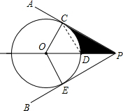 分析 首先连接DC,由CP与⊙O相切于C,可得OC⊥CP,根据直角三角形斜边中线的性质得出OC=OD=CD=1,从而得出△COD是等边三角形,得出∠COD=60°,然后根据勾股定理求得PC的长,然后由S阴影=S△COP-S扇形DOC,即可求得答案.