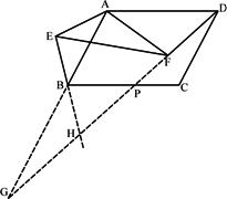 (1)证明:延长DF分别交AB、BE于点P、G 1分 在正方形ABCD和等腰直角△AEF中 AD=AB,AF=AE, ∠BAD=∠EAF=90° ∴∠FAD=∠EAB