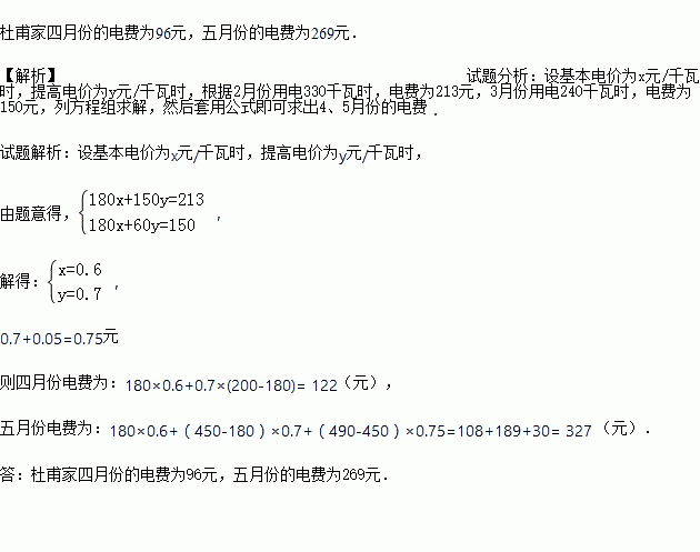 为鼓励居民节约用电,广州市自2012年以来对家庭用电收费实行阶梯电价,即每月对每户居民的用电量分为三个档级收费,第一档为用电量在180千瓦时(含180千瓦时)以内的部分,执行基本价格;第二档为用电量在180千瓦时到450千瓦时(含450千瓦时)的部分,实行提高电价;第三档为用电量超出450千瓦时的部分,比第二档的单价每千瓦时提高0.05元. 海珠区的李白同学家今年2月份用电330千瓦时,电费为213元,3月份用电240千瓦时,电费为150元.已知我市的另一位居民杜甫家今年4、5月份的家庭用电量分别为200和 490千瓦时,请你依据题目条件,计算杜甫家4、8月份的电费分别为多少元?