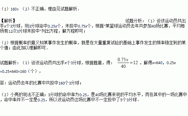 (2)在其中的一场比赛中,该运动员3分球共出手20次,小亮说,该运动员这场比赛中一定投中了5个3分球,你认为小亮的说法正确吗?请说明理由.