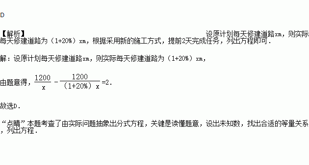 某工程队准备修建一条长1200m的道路,由于采用新的施工方式,实际每天修建道路的速度比原计划快20%,结果提前2天完成任务.若设原计划每天修建道路x m,则根据题意可列方程为( )