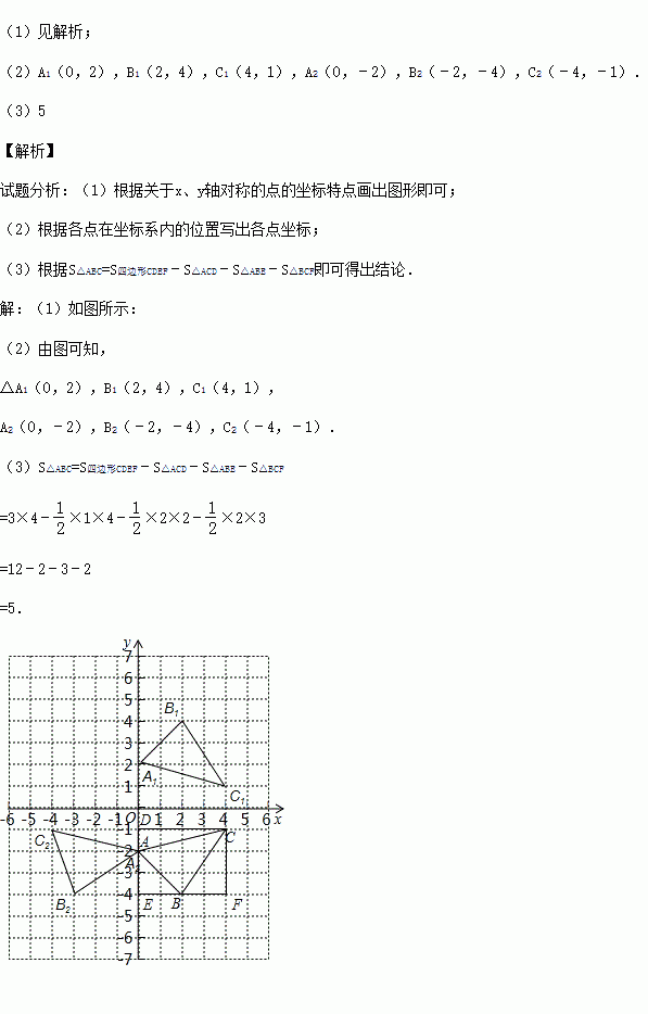 (1)分别画出与△ABC关于x轴、y轴对称的图形△A1B1C1和△A2B2C2;