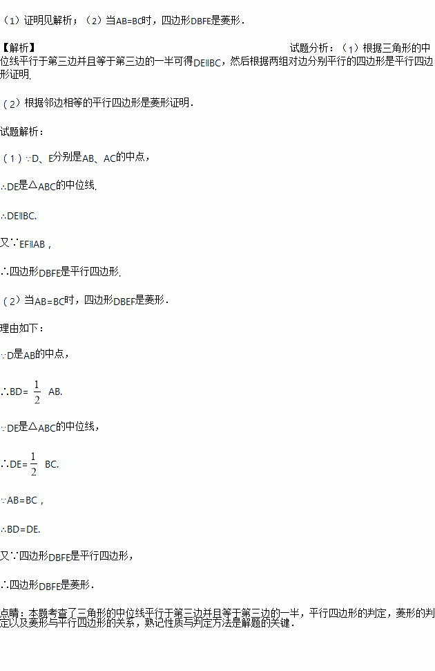 (2)当△ABC满足什么条件时,四边形DBFE是菱形?为什么?