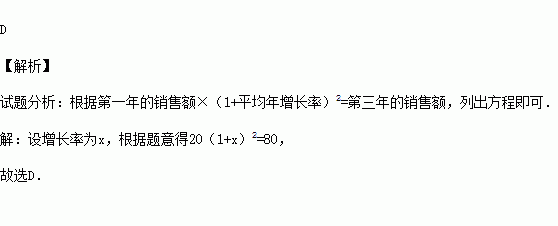 (2015•益阳)沅江市近年来大力发展芦笋产业,某芦笋生产企业在两年内的销售额从20万元增加到80万元.设这两年的销售额的年平均增长率为x,根据题意可列方程为( )
