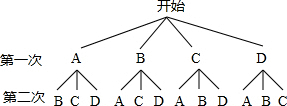 (1)用树状图(或列表法)表示两次摸牌所有可能出现的结果(纸牌用A,B,C,D表示);