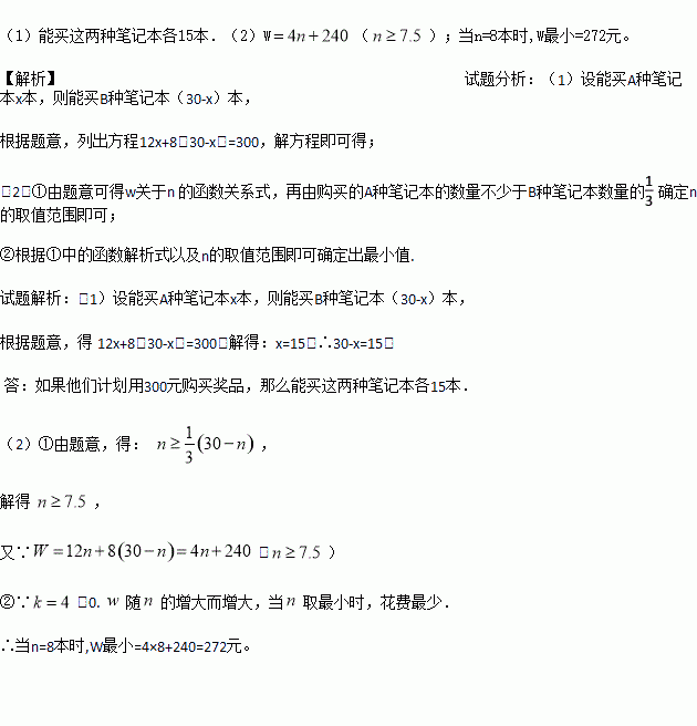 (1)如果他们计划用300元购买奖品,那么能买这两种笔记本各多少本?