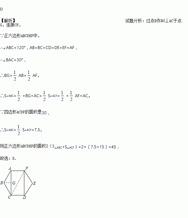 如图,在正六边形ABCDEF中,四边形BCEF的面积为30,则正六边形ABCDEF的面积为( )
