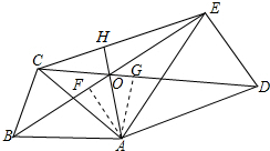 分析 过点A分别作AF⊥BE于F,AG⊥CD于G.先证明△BAE≌△CAD,由全等三角形的性质得出AF=AG,得出OA平分∠BOD,再利用对顶角相等,即可得出结论.
