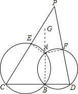 分析:连接BA并延长,由圆内接四边形的性质可知∠PEA=∠ABC,∠PFA=∠ABD,∠D=∠GAF,∠C=∠GAE,然后由三角形的内角和等于180°,可得∠P+∠C+∠D=∠P+∠PAE+∠PAF=180°,∠PEA+∠PFA=∠ABC+∠ABD=180°,继而可证明P、E、A、F四点共圆.