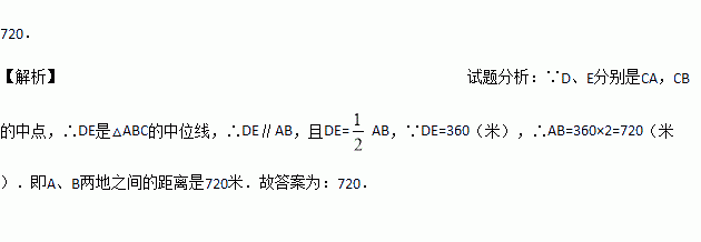 如图,A、B两地被一小山阻隔,为测量A、B两地间的距离,在地面上一点C,连接CA、CB,分别取CA,CB的中点D、E,测得DE的长度为360米,则A、B两地之间的距离是 ______ 米.