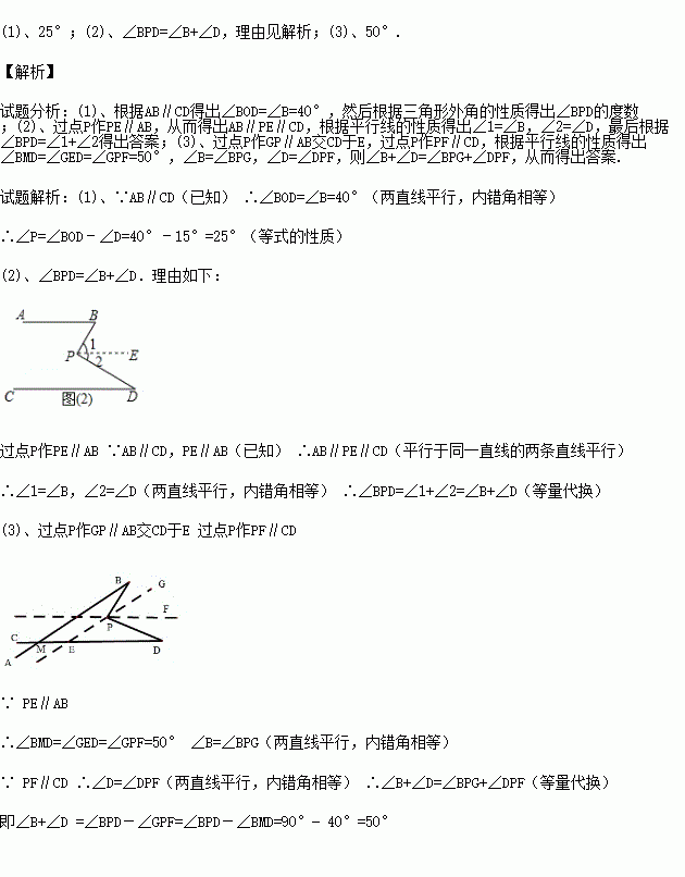 (1)、如图(1),AB∥CD,点P在AB、CD外部,若∠B=40°,∠D=15°,则∠BPD °.
