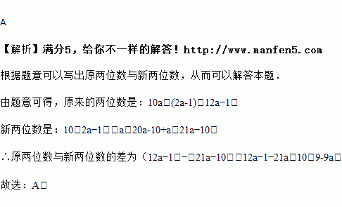 一个两位数的十位数字为,个位数字比十位数字的2倍少1,若把这个两位数十位上的数字与个位上的数字交换位置组成一个新两位数,则原两位数与新两位数的差为( )![]()