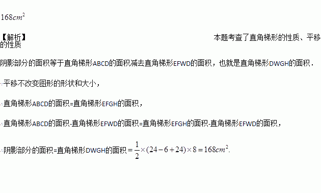 如图所示,把直角梯形ABCD沿AD方向平移到梯形EFGH,HG=24 cm,WG=8 cm, WC=6 cm,则阴影部分的面积为_________.