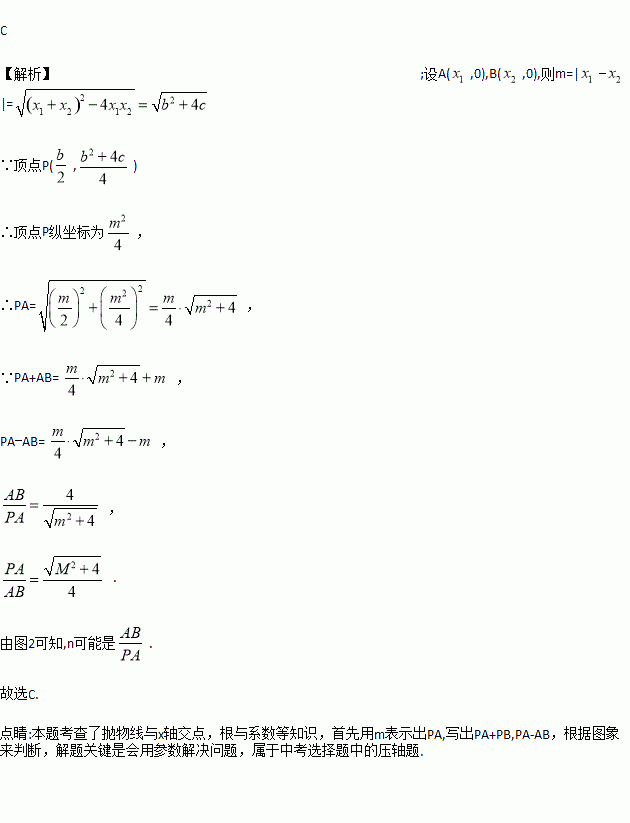 如图1,抛物线y=-x2+bx+c的顶点为P,与x轴交于A,B两点.若A,B两点间的距离为m,n是m的函数,且表示n与m的函数关系的图象大致如图2所示,则n可能为( )