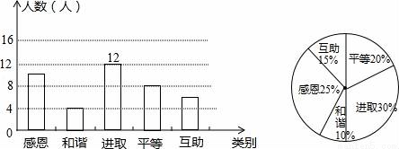 (1)该班有 人,学生选择“进取”观点的有 人,在扇形统计图中,“和谐”观点所在扇形区域的圆心角是 度;