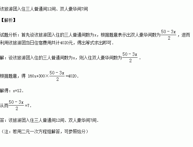 一个50人的旅游团到该酒店入住,选择了一些三人普通间和双人豪华间入住,且恰好住满.已知该旅游团当日住宿费用共计4020元,问该旅游团入住的三人普通间和双人豪华间各为几间?