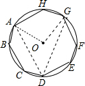 分析 连结OA、OG、AD、GD,如图,根据圆心角、弧、弦的关系得到$\widehat{AB}$=$\widehat{CD}$=$\widehat{EF}$=$\widehat{HG}$,$\widehat{BC}$=$\widehat{DE}$=$\widehat{FG}$=$\widehat{AH}$,则$\widehat{AH}$+$\widehat{HG}$=$\widehat{AB}$+$\widehat{BC}$=$\widehat{CD}$+$\widehat{DE}$=$\widehat{EF}$+$\widehat{GF}$,所以∠AOG=90°,然后根据圆周角定理计算出∠ADG=45°,再利用圆内接四边形的性质求∠AHG.