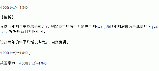 据调查,某市2011年的房价为4 000元/平方米,预计2013年将达到4 840元/平方米,求这两年的年平均增长率,设年平均增长率为x,根据题意,所列方程为 .