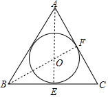 解答 解:(1)分别作∠BAC、∠ABC的角平分线AE、BF,二者交于点O,以点O为圆心、OE为半径作圆O(如图所示),圆O即是正△ABC的内切圆.![]()