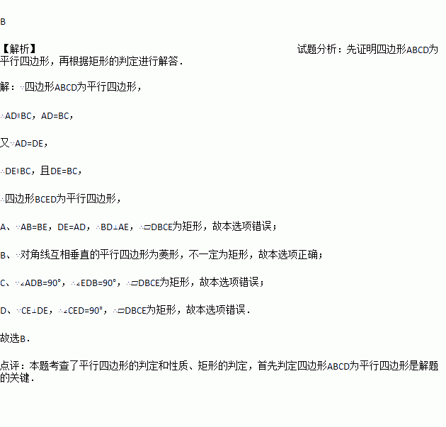 如图:四边形ABCD为平行四边形,延长AD至E,使DE=AD,连接EB,EC,DB.添加一个条件,不能使四边形DBCE为矩形的是( )