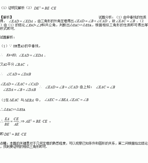 如下图,已知在△ABC中,AD平分∠BAC,EM是AD的中垂线,交BC延长线于E.