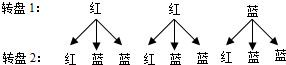 (8分)小颖为学校联欢会设计了一个“配紫色”的游戏;下面是两个可以自由转动的转盘,每个转盘被分成面积相等的几个扇形,游戏者同时转动两个转盘,如果转盘转出了红色,转盘转出了蓝色,那么他就赢了,因为红色和蓝色在一起配成了紫色.