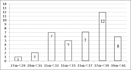 | 年龄段(岁) | 27≤x<29 | 29≤x<31 | 31≤x<33 | 33≤x<35 | 35≤x<37 | 37≤x<39 | 39≤x<41 |