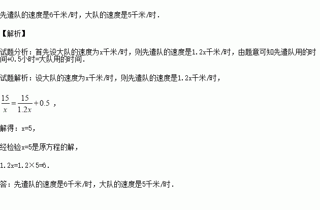 某中学组织学生到离学校15km的东山游玩,先遣队与大队同时出发,先遣队的速度是大队的速度的1.2倍,结果先遣队比大队早到0.5h,先遣队的速度是多少?大队的速度是多少?
