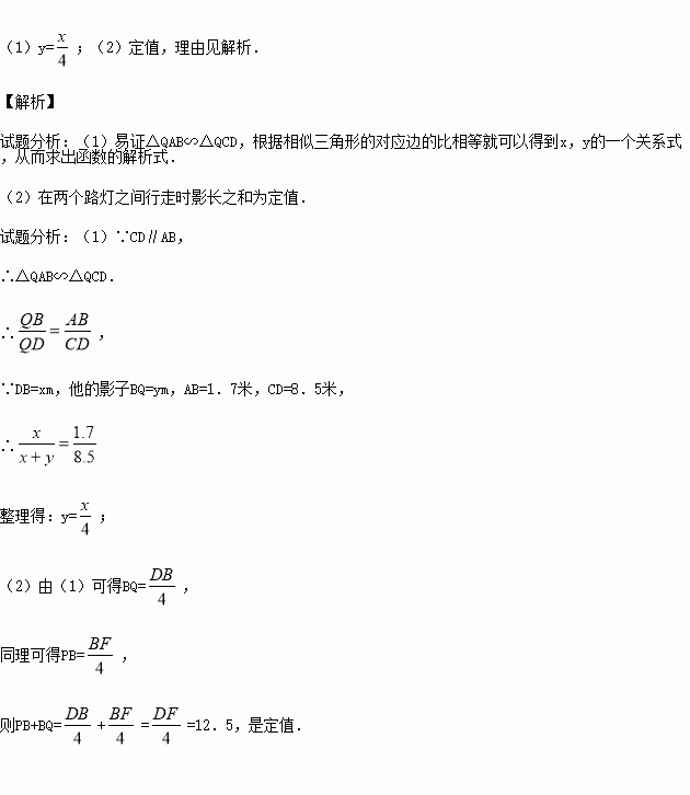 李华晚上在两站相距50m的路灯下来回散步,DF=50m.已知李华身高AB=1.7m,灯柱CD=EF=8.5m.