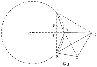 £¨3£©¸ù¾ÝÐýתµÄÐÔÖÊ×÷¸¨ÖúÏߣ¬¹¹½¨µÈ±ß¡÷BHD£¬ÀûÓÃÇó¡÷ABHÃæ»ýµÄ×î´óÖµ£¬À´È·¶¨ËıßÐÎABCDÃæ»ýµÄ×îСֵ£¬¡÷ABHÃæ»ýµÄ×î´óÖµÀûÓã¨1£©µÄ½áÂÛ£¬×÷¸¨ÖúÔ²¿ÉµÃ³ö£¬´Ó¶øµÃ³ö½áÂÛ£®