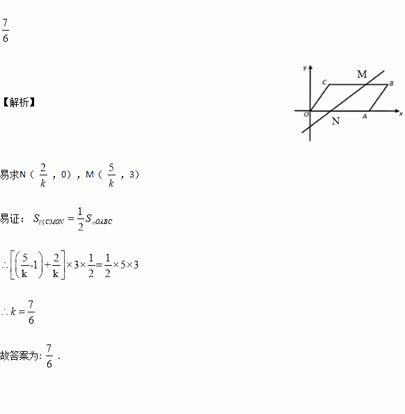 如图,已知□OABC,在平面直角坐标系中,A(5,0),C(1,3),直线y=kx-2与BC、OA分别交于M,N,且将□OABC的面积分成相等的两部分,则k的值是_______