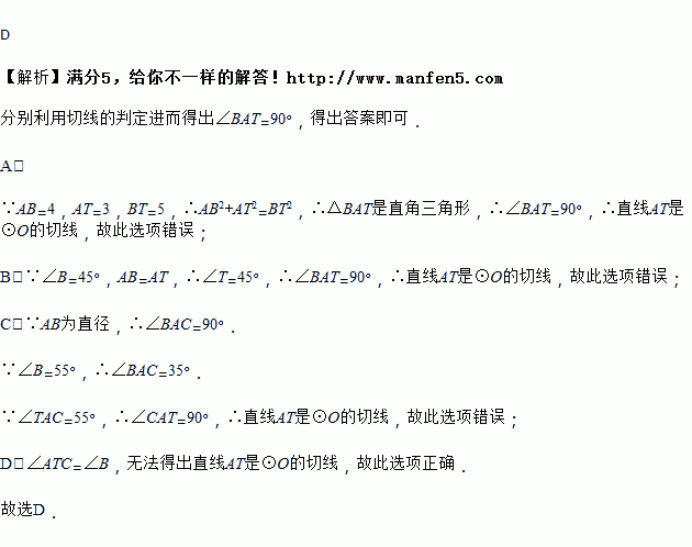 如图,AB是⊙O的直径,下列条件中不能判定直线AT是⊙O的切线的是( )