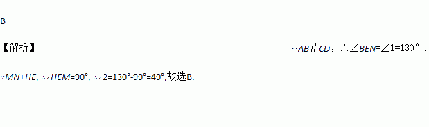 如图:AB∥CD,直线MN与AB交于E,过点E作直线HE⊥MN,∠1=130°,则∠2等于( )