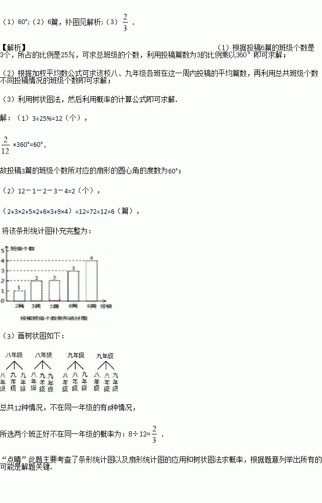(2)求该校八、九年级各班在这一周内投稿的平均篇数,并将该条形统计图补充完整.