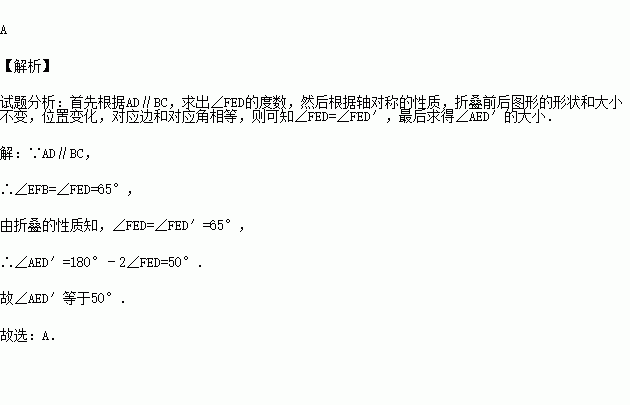 如图,把一个长方形纸片沿EF折叠后,点D、C分别落在D′、C′的位置,若∠EFB=65°,则∠AED′等于( )