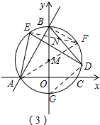 £¨3£©Èçͼ£¨3£©Ëùʾ£¬ÑÓ³¤AM½»¡ÑMÓÚµãF£¬Á¬½ÓBF¡¢EF¡¢CG£®ÏÈÖ¤Ã÷ED¡ÎBF£¬ÓÚÊǵõ½$\widehat{BE}=\widehat{FD}$£¬È»ºóÖ¤µÃ$\widehat{EF}=\widehat{BD}$£¬¹Ê´Ë¡ÏEAF=¡ÏBGD£¬Éè¡ÏEAF=¡ÏBGD=¦Á£¬ÓÉÈñ½ÇÈý½Çº¯ÊýµÄ¶¨Òå¿ÉÖª£ºAE=AF•cos¦Á=2rcos¦Á£¬BD=GBsin¦Á=2rsin¦Á£¬ÓÉsina2+cosa2=1¿ÉÖª£ºAE2+BD2=4r2£¨rΪ¡ÑMµÄ°ë¾¶£©£®