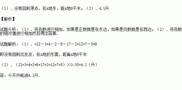 某检修小组乘汽车检修公路道路。向东记为正,向西记为负。某天自A地出发。所走路程(单位:千米)为:+22,-3,+4,-2,-8,-17,-2,+12,+7,-5;