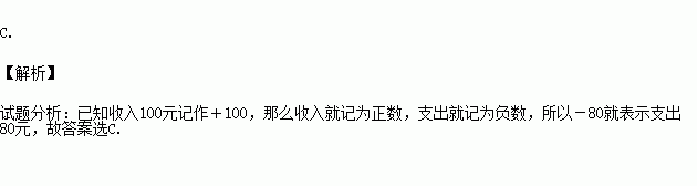 中国人很早开始使用负数,中国古代数学著作《九章算术》的“方程”一章,在世界数学史上首次正式引入负数、如果收入100元记作+100,那么-80元表示( )