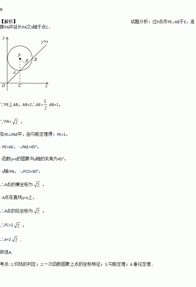 如图,在平面直角坐标系xOy中,⊙P的圆心是(2,a)(a >0),半径是2,与y轴相切于点C,直线y=x被⊙P截得的弦AB的长为