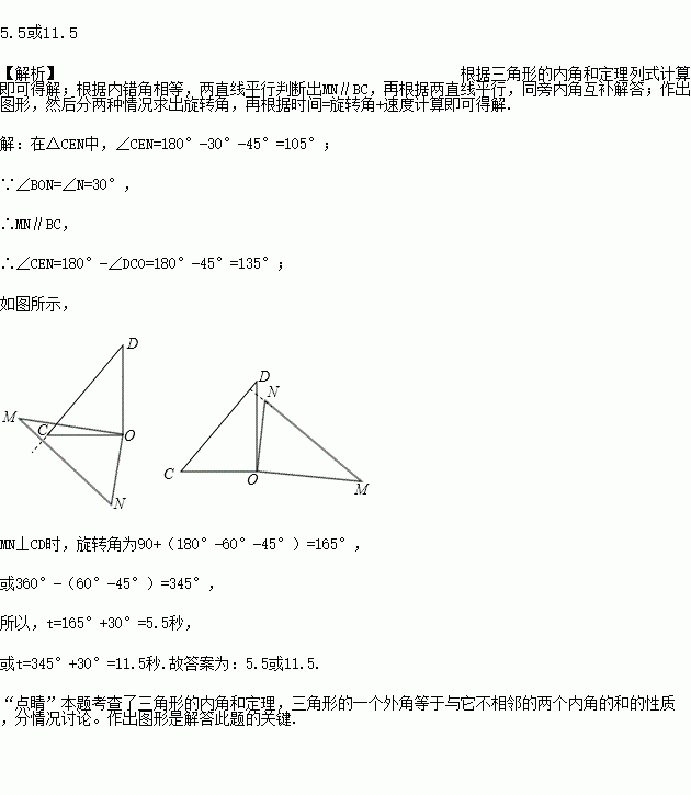 如图,将一副直角三角板放在同一条直线AB上,其中∠ONM=30°,∠OCD=45°.将三角尺OCD绕点O按每秒30°的速度沿顺时针方向旋转一周,在旋转的过程中,当第________ 秒时,直线CD恰好与直线MN垂直.