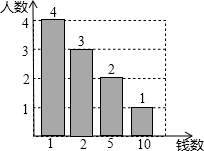 解答 解:(1)捐款5元的有2人,占20%,