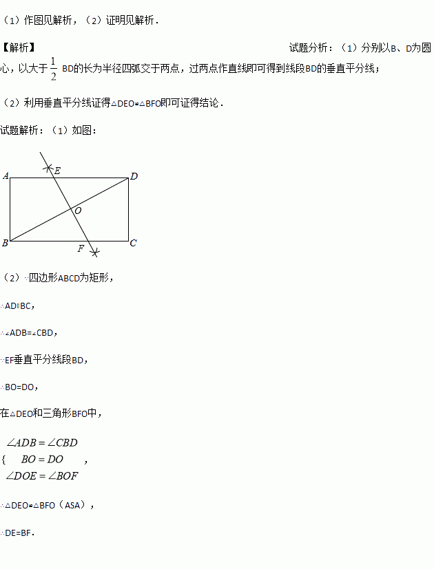 (1)作BD的垂直平分线EF,分别交AD、BC于点E、F,垂足为点O.(要求用尺规作图,保留作图痕迹,不要求写作法);