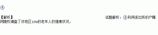 某课外兴趣小组为了了解所在地区老年人的健康状况,分别做了下列四种不同的抽样调查:①在公园调查了1 000名老年人的健康状况;②在医院调查了1 000名老年人的健康状况;③调查了10名老年邻居的健康状况;④利用派出所的户籍网随机调查了该地区10%的老年人的健康状况.你认为抽样比较合理的是 (填序号).