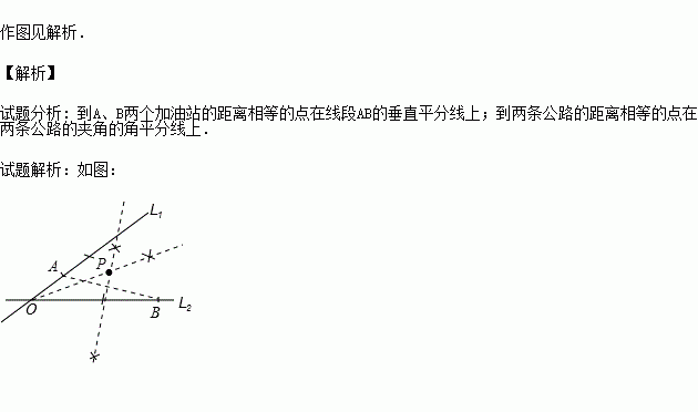相交于点O,现准备在∠AOB内建一个油库,要求油库的位置点P满足到A、B两个加油站的距离相等,而且P到两条公路